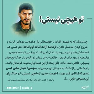 مخمصه ای بود برای خودش! خلاصه به هر سختیای که بود از چنگ بچههای بسیجی خلاص شد، اما به جای اینکه از این همه ابراز محبت خوشحال باشد، با چشمانی پر از اشک به خودش نهیب می زد: «مهدی! خیال نکنی کسی شدی که اینا این قدر بهت اهمیت میدن، تو هیچی نیستی؛ تــو خاک پای این بسیجی هایی…!»