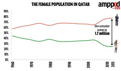 در قطر تعداد مردان چهار برابر زنان است. در قطر، کشوری با جمعیت 2.5 میلیون نفر، تنها 700 هزار زن وجود دارد. این به دلیل هجوم گسترده کارگران مهاجر در کشور است که اکثراً مردانی هستند که سعی در تأمین مخارج خانواده خود دارند.[1]