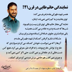 شهید طهرانی مقدم، فقط در بحث موشکی خدمت نکرده است. کتابی از ایشان به نام «مردی با آرزوهای دور بُرد» چاپ شده است که نشان میدهد جهاد اجتماعی ایشان کمتر از جهادهای دیگر آن بزرگوار نبود. هر کس در هر شغل و جایگاهی که هست، باید جهاد اجتماعی را وظیفه خودش بداند.
