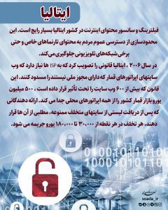 فیلتر اینترنت در ایتالیا عمدتاً از طریق بخشنامه های دولت به ISP ها مورد توجه مردم قرار گرفته است. در سال 2006 ، ایتالیا قانونی را تصویب كرد كه به ISP ها نیاز دارد كه وب سایتهای اپراتورهای قمار كه دارای مجوز ملی نیستند را مسدود كنند. این قانون که بیش از 600 وب سایت را تحت تأثیر قرار داده است ، 500 میلیون یورو بازار قمار کشور را از همه اپراتورهای محلی جدا می کند. ارائه دهندگانی که پس از دریافت لیستی از سایتهای متخلف ممنوعه، مطلبی از آن ها قرار دهند، هر تخلف در هر نقطه از 30،000 تا 180،000 یورو جریمه می شود.