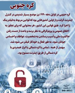کره جنوبی در اوایل دهه 1990 نیز موضع بسیار شدیدی در کنترل اینترنت گرفت و از اولین کشورهایی بود که قوانین مربوط به فیلترینگ را اجرا کرد. طبق قوانین این کشور، هر محتوایی که برای تجاوز به اخلاق عمومی و پرونوگرافی به نظر برسد و باعث از دست رفتن حاکمیت ملی و آسیب رساندن به شخصیت، عواطف و احساس جوانان شود، به طور فعال و خودکار فیلتر می شود شد. مهمتر از همه ، تماس با کره شمالی یا ابراز همدردی با کره شمالی از طریق اینترنت ممنوع بود.[1]
